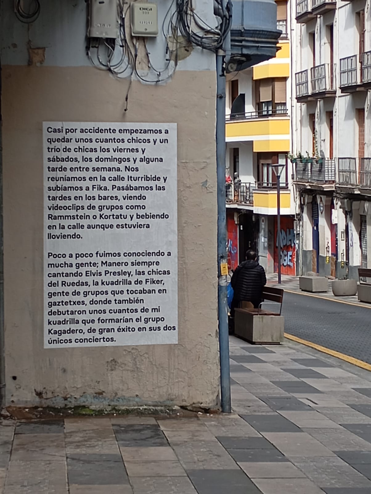 Ia istripuz, mutil batzuk eta neska hirukote bat ostiral eta larunbatetan geratzen hasi ginen, baita igandeetan eta astegunetan arratsalderen batean ere. Iturribide kalean elkartu eta Fikara igotzen ginen. Arratsaldeak tabernetan pasatzen genituen, Rammstein edo Kortatu taldeen bideoklipak ikusten eta kalean edaten, euria ari bazuen ere. Pixkanaka-pixkanaka jende asko ezagutzen joan ginen; Manero beti Elvis Presley abesten, Las Ruedaseko neskak, Fiker-en kuadrilla, gaztetxeetan jotzen zuten taldeetako jendea, non Kagadero taldea osatuko zuten nire kuadrillako batzuk ere debutatu zuten ere, bi kontzertu bakarretan arrakasta handia izan zutenak.